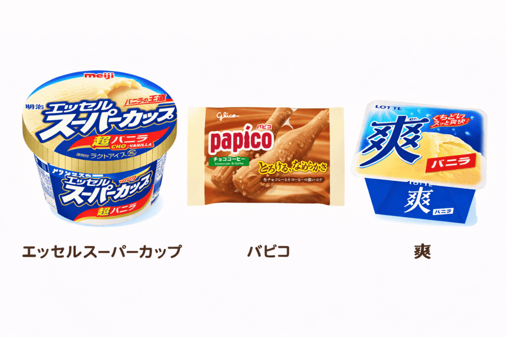 実例として、明治エッセルスーパーカップ 超バニラはラクトアイスで植物性脂肪分13.0%、爽 バニラもロッテの資料でラクトアイス、パピコ チョココーヒーもラクトアイスです。イメージだけで“ヘルシーそう”と判断しない方が良いです。
